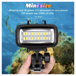 Enhance your underwater photography and videography with the Waterproof Underwater LED Light. This LED light offers deep waterproof capability of up to 40M, making it suitable for various environments. With a compact design, it doesn’t block other accessories, and features 20 LEDs with a 5500K color temperature. It includes three lighting modes: high, low, and SOS, and is compatible with GoPro, SJCAM, Xiaomi Yi, and other sports action cameras. The built-in 1900mAh rechargeable battery ensures long-lasting performance.
