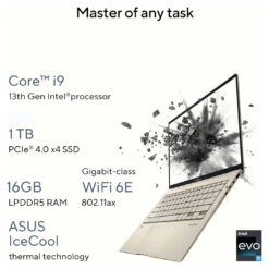 ASUS Zenbook 14X OLED blends elegance with extreme performance. With Intel Evo certification, it features a 13th Gen Intel Core i9-13900H processor, ultra-fast 1TB PCIe Gen 4 SSD, and 16GB LPDDR5 RAM — all wrapped in a sleek 1.5 kg chassis. The OLED touchscreen delivers ultra-rich visuals at 2.8K resolution with a 120Hz refresh rate, while Smart Amp audio, IR camera, and Wi-Fi 6E offer next-gen connectivity. Ideal for creators, professionals, and anyone seeking style with substance in Jordan.