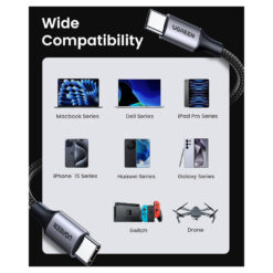 The UGREEN USB-C to USB-C charger cable delivers up to 60W of fast charging power, making it ideal for powering USB-C devices such as MacBooks, iPads, smartphones, and more. It supports USB Power Delivery (PD) 3.0 and Quick Charge (QC) for efficient charging. With a robust and flexible nylon braided design, this cable ensures durability for long-term use. Additionally, its high-speed data transfer capability allows seamless synchronization of files, making it a must-have for both work and travel.